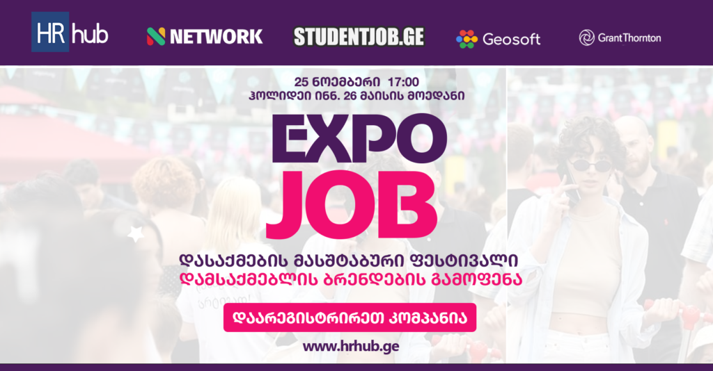 HR hub-ის ორგანიზებით, 25 ნოემბერს თბილისში, ჰოლიდეი ინნში (26 მაისის ოედანი N1) დასაქმების მასშტაბური ფესტივალი გაიმართება, სადაც წარმოდგენილი იქნება დამსაქმებლის ბრენდები და აქტიური ვაკანსიები.