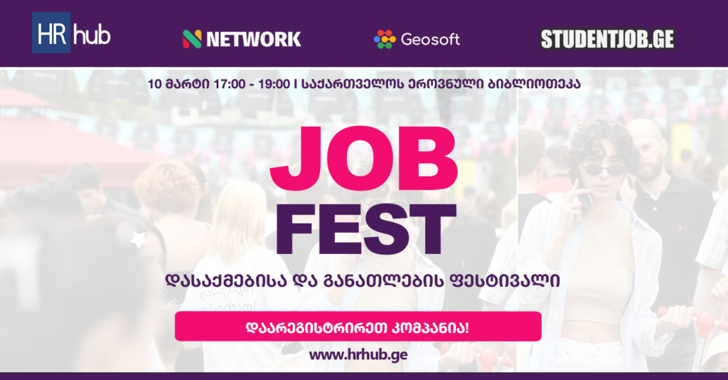 HR hub-ის ორგანიზებით, 10 მარტს 17:00 – 19:00 თბილისში, ეროვნულ ბიბლიოთეკაში დასაქმების მასშტაბური ფესტივალი გაიმართება, სადაც წარმოდგენილი იქნება დამსაქმებლის ბრენდები და აქტიური ვაკანსიები.